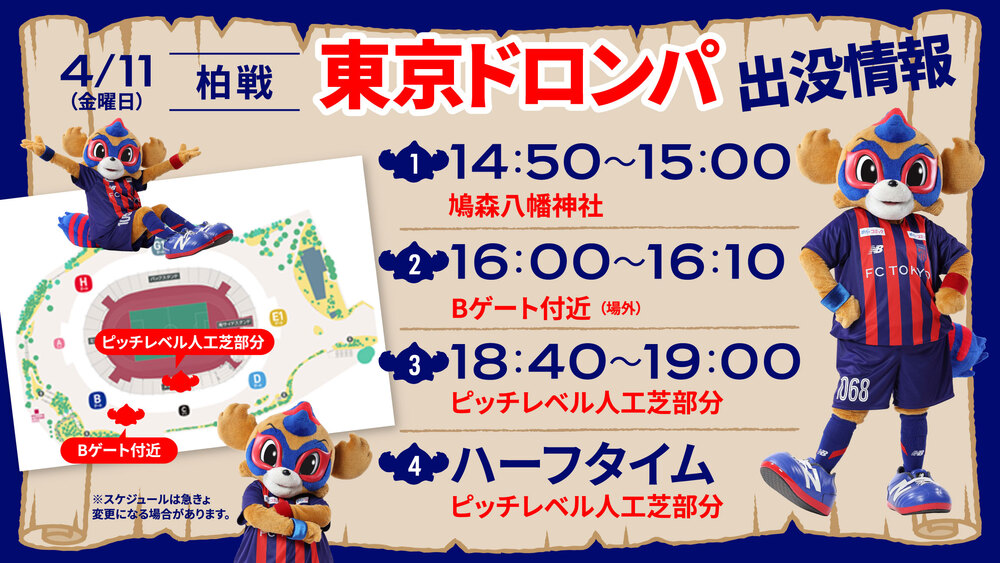 4月11日(金) 2025明治安田J1リーグ 第10節 vs 柏レイソル(19:00キックオフ/国立競技場)に東京ドロンパが下記の通りあらわれます。