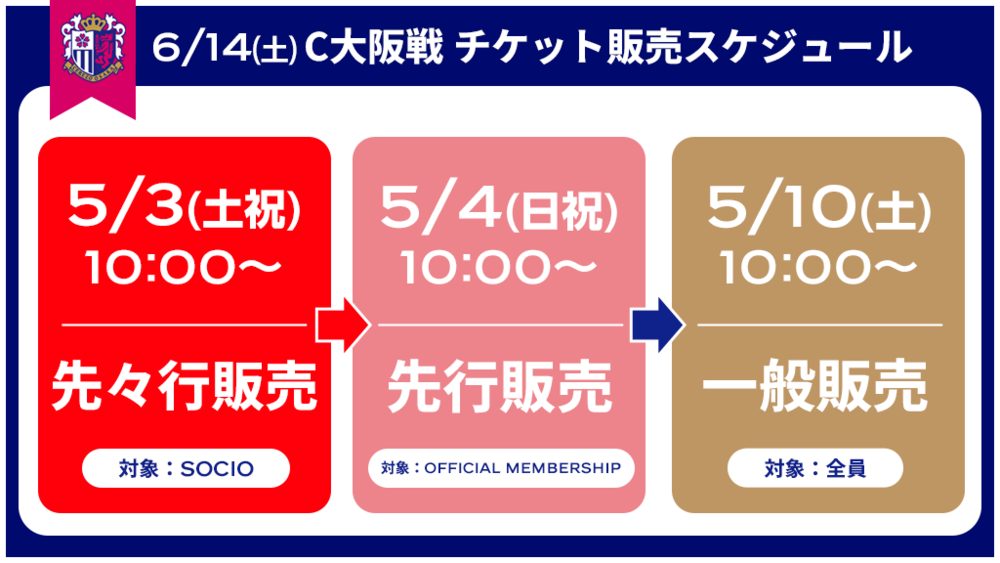 5月3日(土祝)SOCIO先々行販売を開始いたします。SOCIOのみなさまは会員価格にてご購入いただけます(1試合4枚まで)。