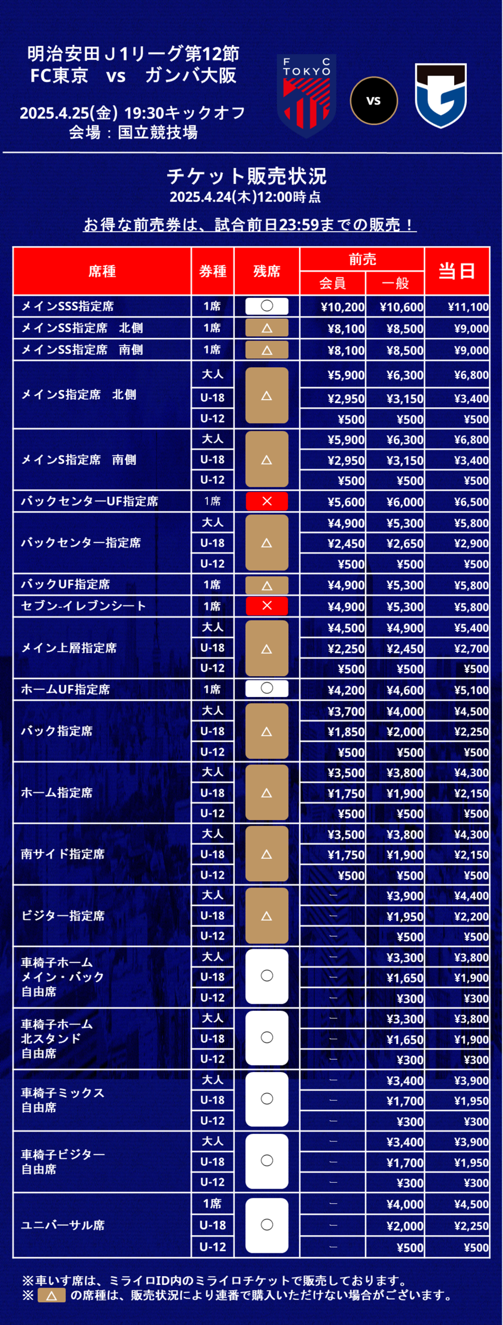 2025明治安田 J1リーグ 第12節 FC東京 vsガンバ大阪(19:30キックオフ/味の素スタジアム)の当日券販売につきまして、下記のとおりお知らせいたします。