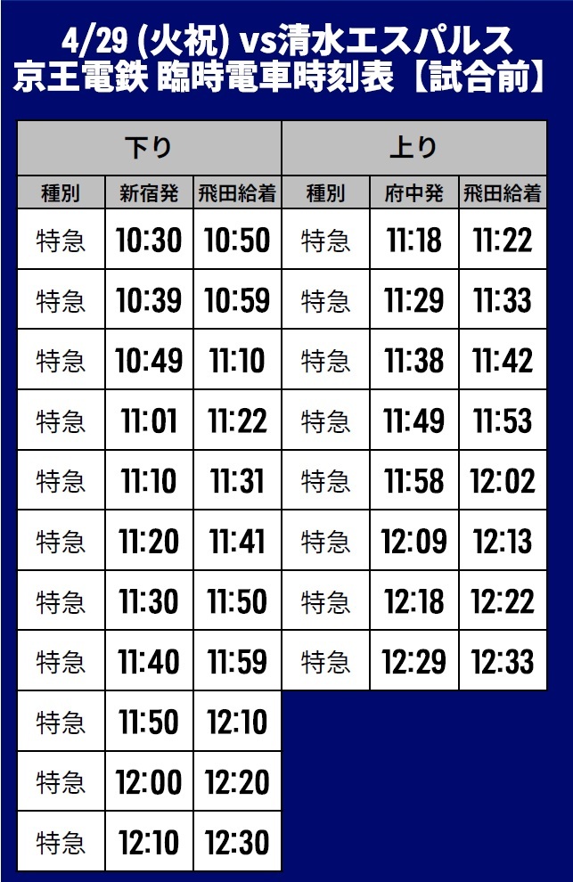 4月29日(火祝) 2025明治安田J1リーグ 第13節 vs清水エスパルス(13:05キックオフ/味の素スタジアム)にて運行される臨時交通アクセス(鉄道)、シャトルバス・路線バスについてご案内いたします。