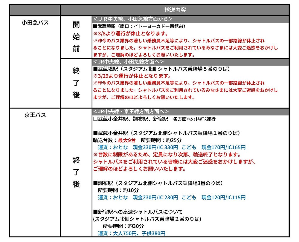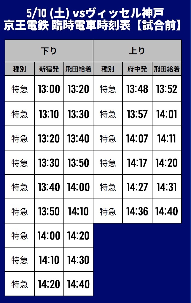 5月10日(土) 2025明治安田J1リーグ 第16節 vsヴィッセル神戸(15:00キックオフ/味の素スタジアム)にて運行される臨時交通アクセス(鉄道)、シャトルバス・路線バスについてご案内いたします。