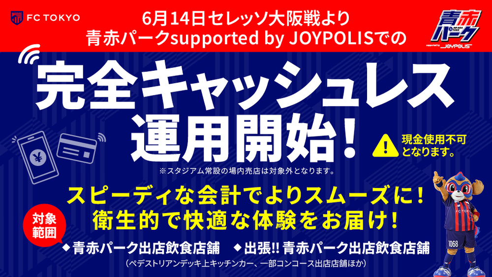 2025シーズンより青赤パーク supported by JOYPOLISでは、完全キャッシュレスでの運用を前提としたキャッシュレス決済端末の導入をしておりましたが、6月14日(土)セレッソ大阪戦より完全キャッシュレス運用へ移行することをお知らせいたします。