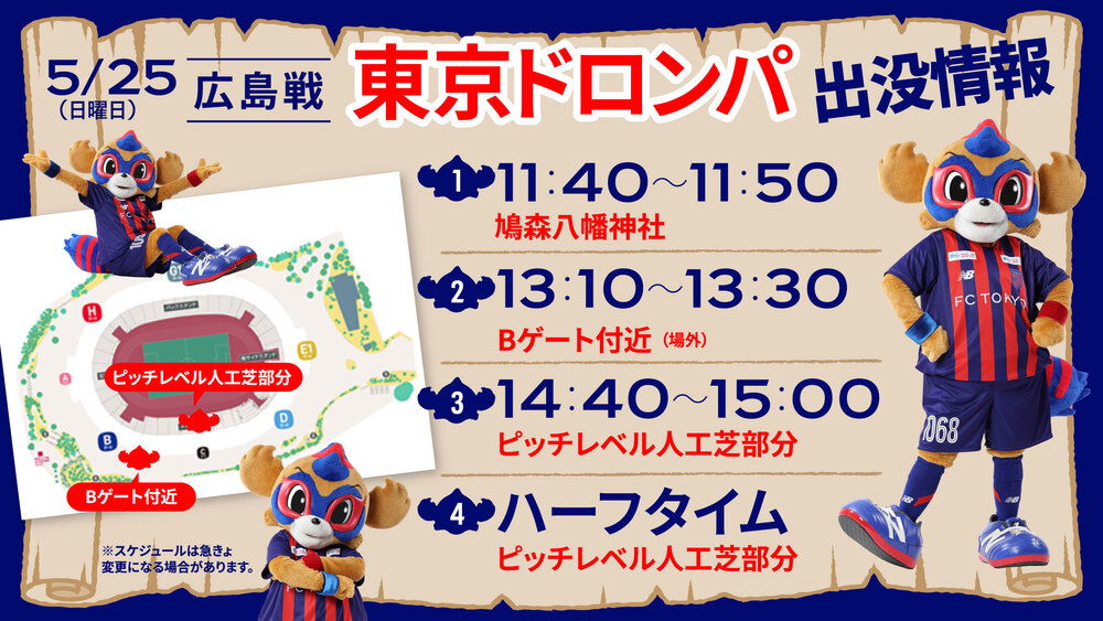 5月25日(日) 2025明治安田J1リーグ 第18節 vs サンフレッチェ広島(15:00キックオフ/国立競技場)に東京ドロンパが下記の通りあらわれます。