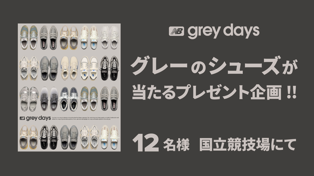 ニューバランス公式ストアアプリ限定のプレゼント企画を実施いたします!当日、試合会場でアプリのくじに参加すると、ニューバランスのグレーのシューズが当たるチャンス!合計12名様にプレゼント!