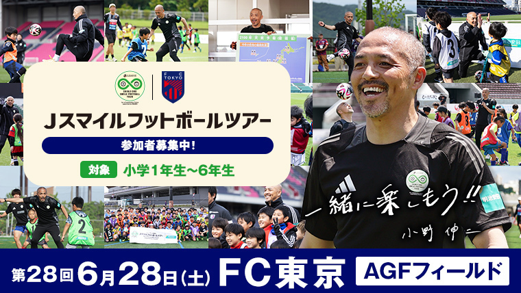 6月28日(土) に開催される明治安田J1リーグ vs横浜FC(19:00キックオフ/味の素スタジアム) の試合前にJリーグによる、小学生の子どもたちを対象とした『サッカー教室』と『サステナトーク』を行う『Jリーグ×小野伸二 スマイルフットボールツアーfor a Sustainable Future supported by 明治安田』が開催されます。