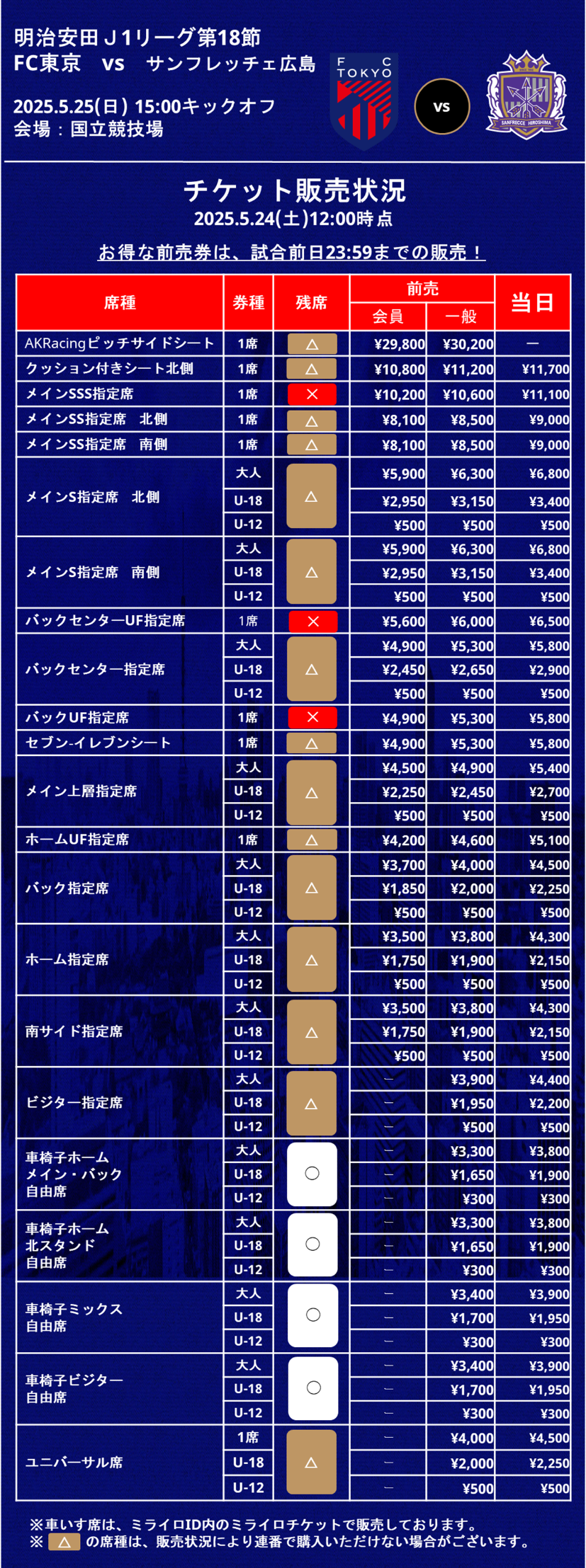 2025明治安田J1リーグ 第18節 FC東京 vsサンフレッチェ広島(15:00キックオフ/国立競技場)の当日券販売につきまして、下記のとおりお知らせいたします。