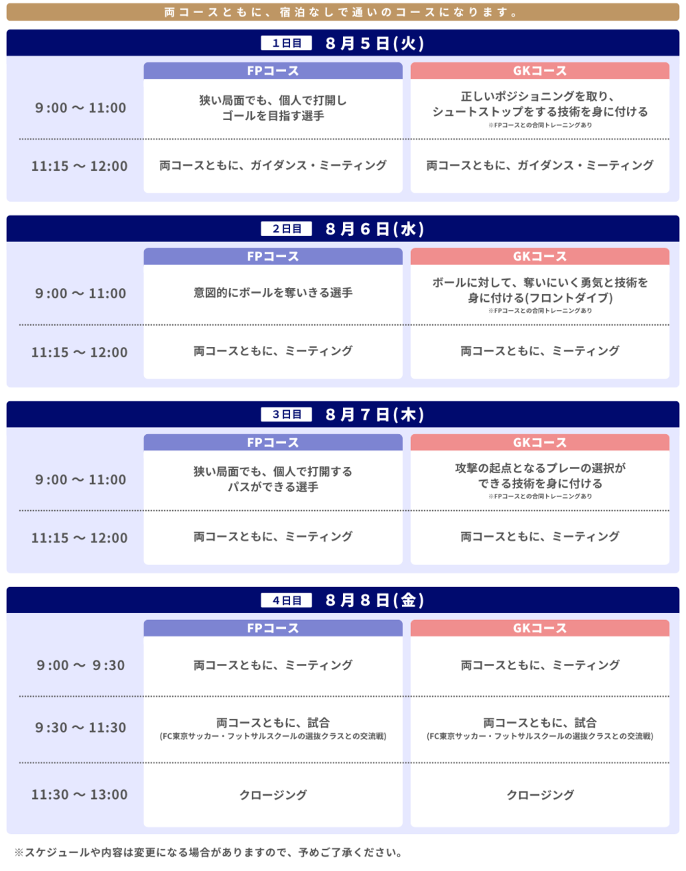 このクリニックでは、『攻守で必要なスキルを高めて、ゲームで圧倒する選手』へと成長するために、FC東京普及部コーチと熱い4日間のトレーニングを行い、最終日にはFC東京サッカー・フットサルスクールの選抜クラスを交えて試合を行います。