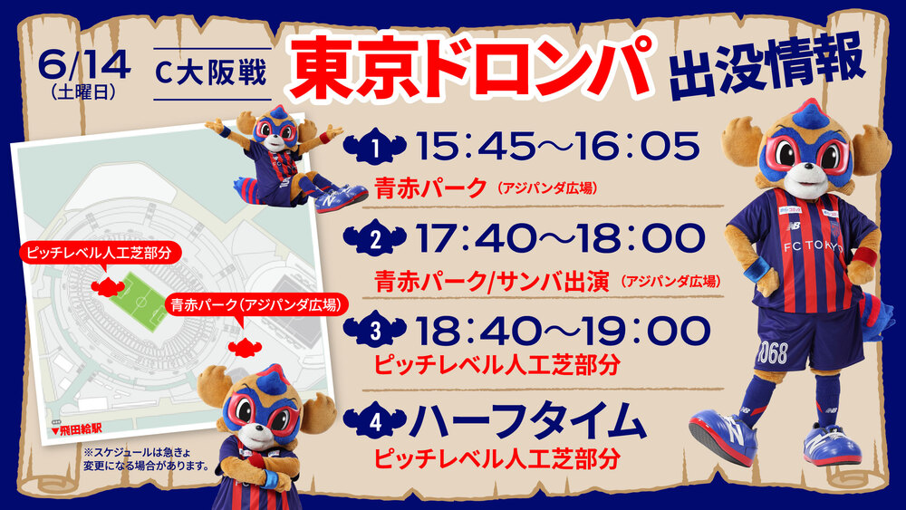 6月14日(土) 2025明治安田J1リーグ 第20節 vsセレッソ大阪(19:00キックオフ/味の素スタジアム)に東京ドロンパが下記の通りあらわれます。