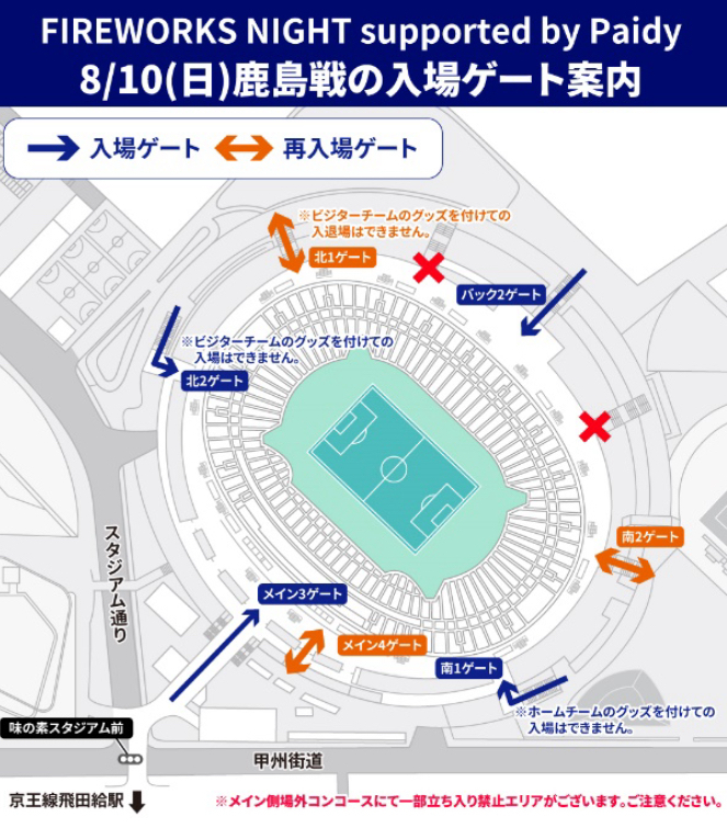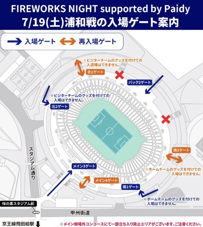 ※7月19日(土)浦和戦、8月10日(日)鹿島戦ともに、再入場ゲート位置に関しては同様の運用を行いますが、浦和戦のみ南2ゲートがビジターチーム専用となります。