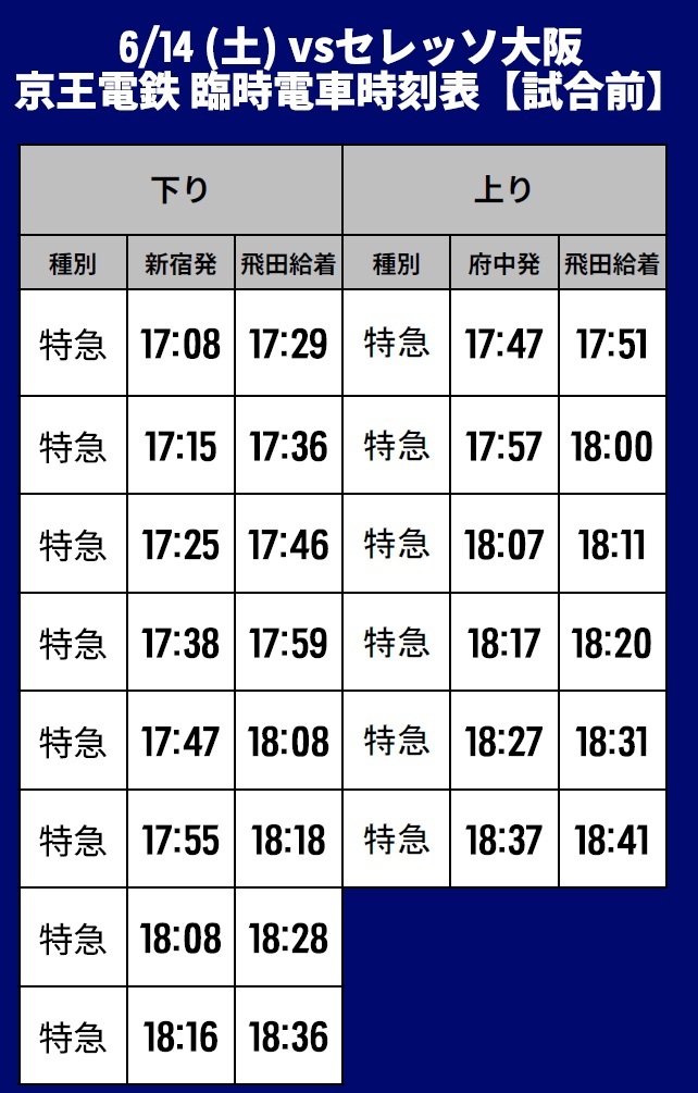 6月14日(土) 2025明治安田J1リーグ 第20節 vsセレッソ大阪(19:00キックオフ/味の素スタジアム)にて運行される臨時交通アクセス(鉄道)、シャトルバス・路線バスについてご案内いたします。