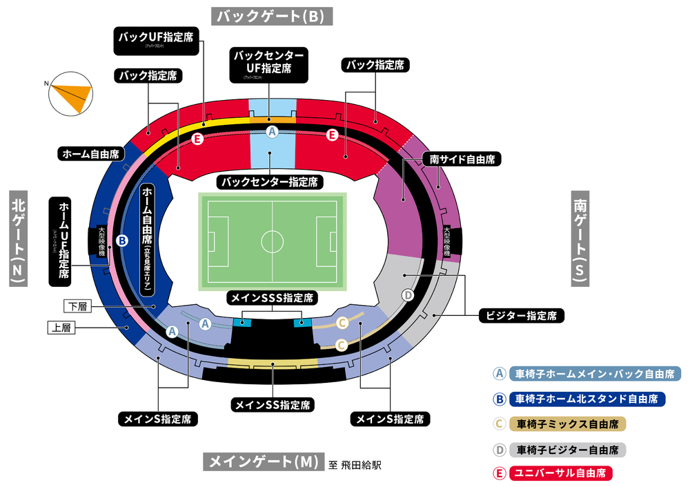 ※ビジターチームのユニフォーム・グッズの着用、およびビジターチームの応援ができる席種は下記エリアとなります。下記エリア以外でのビジターグッズの着用、またビジターチームの応援は一切できません。それ以外の席種は全てFC東京の応援席となります。