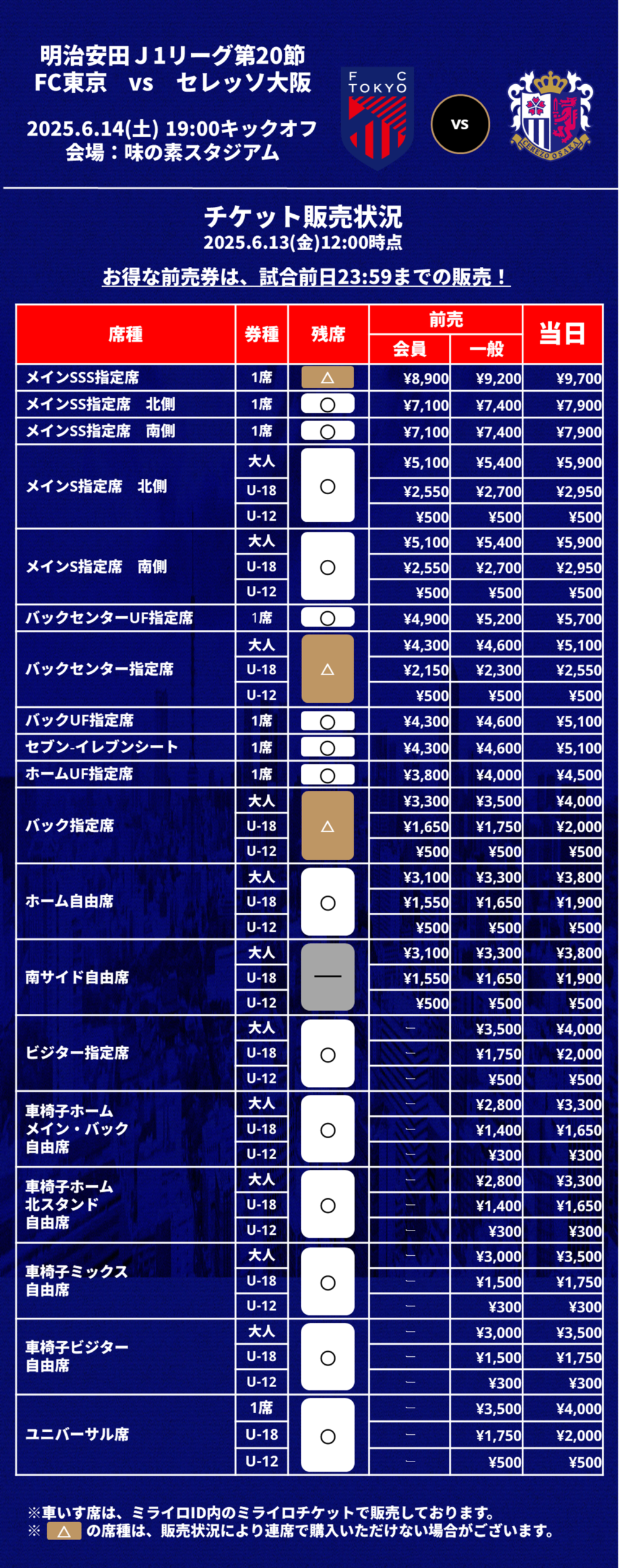 2025明治安田J1リーグ 第20節 FC東京 vsセレッソ大阪(19:00キックオフ/味の素スタジアム)の当日券販売につきまして、下記のとおりお知らせいたします。