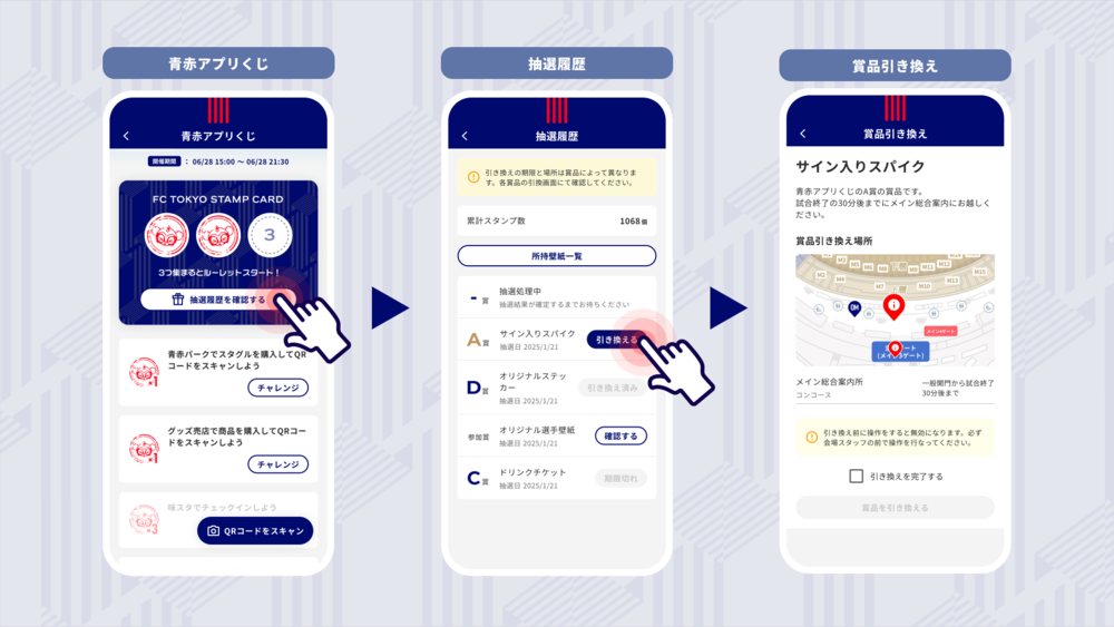 「抽選履歴を確認する」より抽選結果や、賞品の引換場所を確認できます