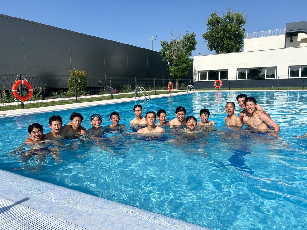 気温35℃を越える非常に暑い中トレーニングを行い、終了後選手たちはプールでクールダウンをしていました。