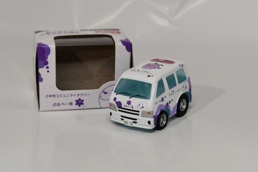 小平市内を走るコミュニティタクシー『ぶるべー号』デザインのチョロQを販売します。ぶるべー号デザインのチョロQは、おもちゃとして遊ぶほか、見た目のかわいらしさからプレゼントとしても喜ばれます。観戦の記念にいかがですか。