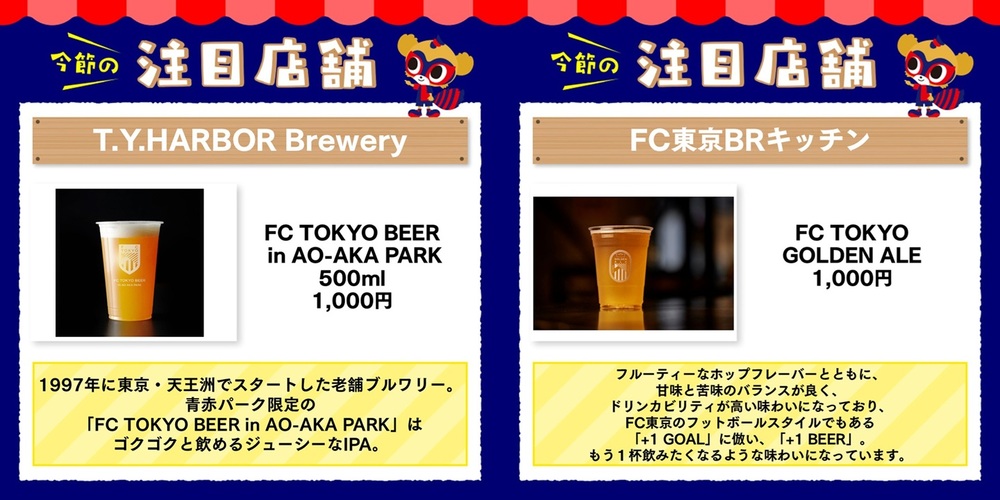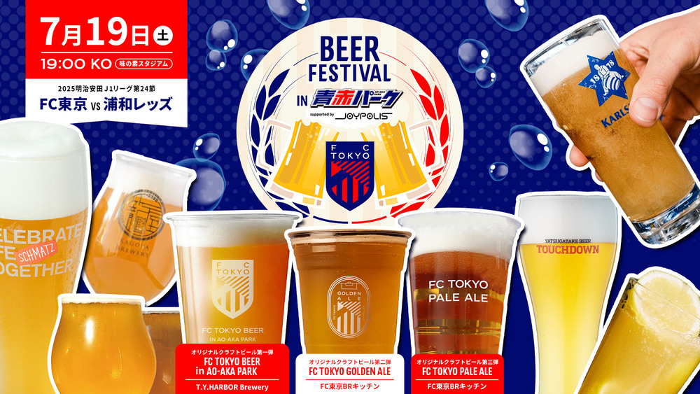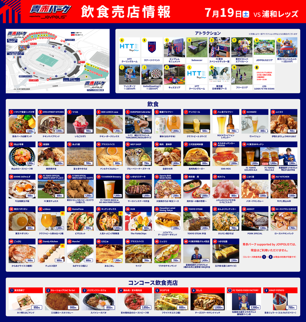 7月19日(土) 2025明治安田J1リーグ 第24節 vs浦和レッズ(19:00キックオフ/味の素スタジアム)の、青赤パークsupported by JOYPOLIS (場外)、出張!! 青赤パーク supported by JOYPOLIS、スタジアム内コンコース(場内)売店にて販売する飲食情報をお知らせいたします。