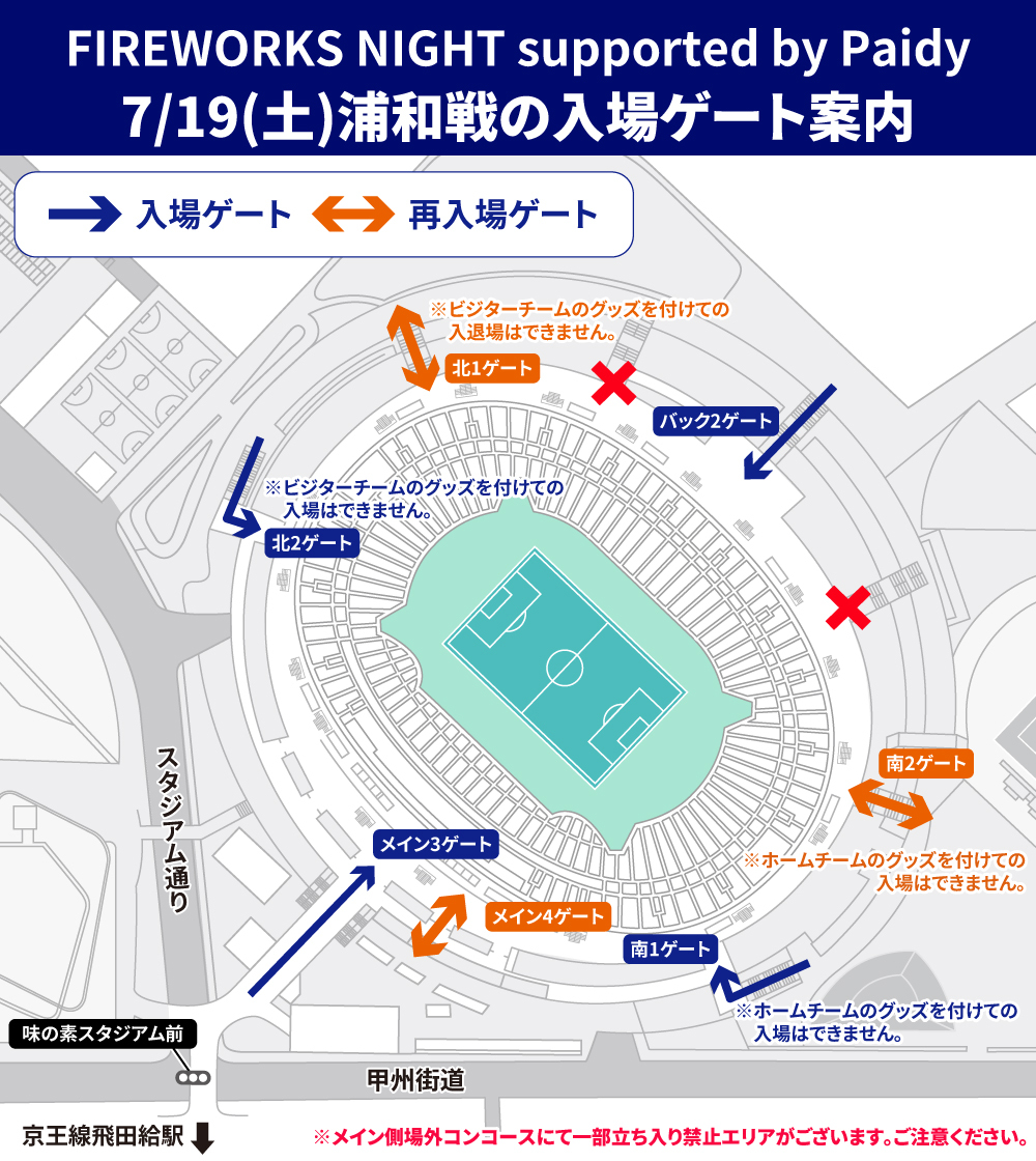 『FIREWORKS NIGHT supported by Paidy』の演出を行う関係で再入場ゲートが変更となりますのでご注意ください。