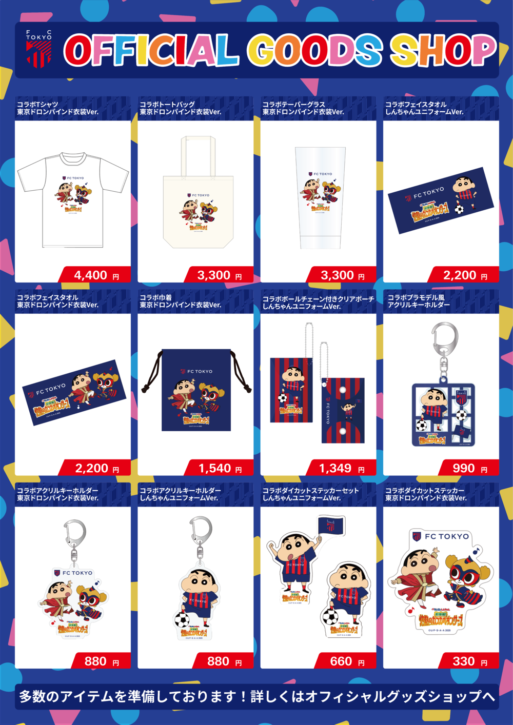 FC東京のユニフォームを身に纏ったしんちゃんや映画のインド衣装を身に纏った東京ドロンパのアイテムがラインナップ。 この機会にぜひお買い求めください!