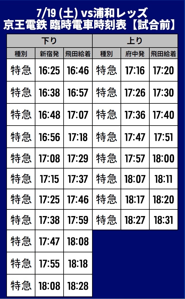 7月19日(土) 2025明治安田J1リーグ 第24節 vs浦和レッズ(19:00キックオフ/味の素スタジアム)にて運行される臨時交通アクセス(鉄道)、シャトルバス・路線バスについてご案内いたします。