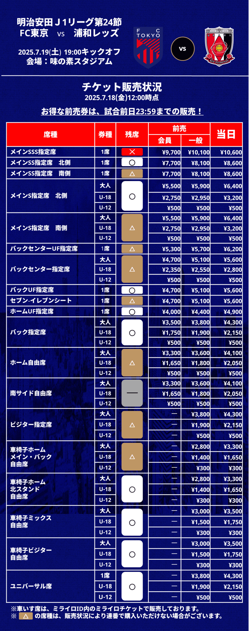 2025明治安田 J1リーグ 第24節 FC東京 vs浦和レッズ(19:00キックオフ/味の素スタジアム)の当日券販売につきまして、下記のとおりお知らせいたします。