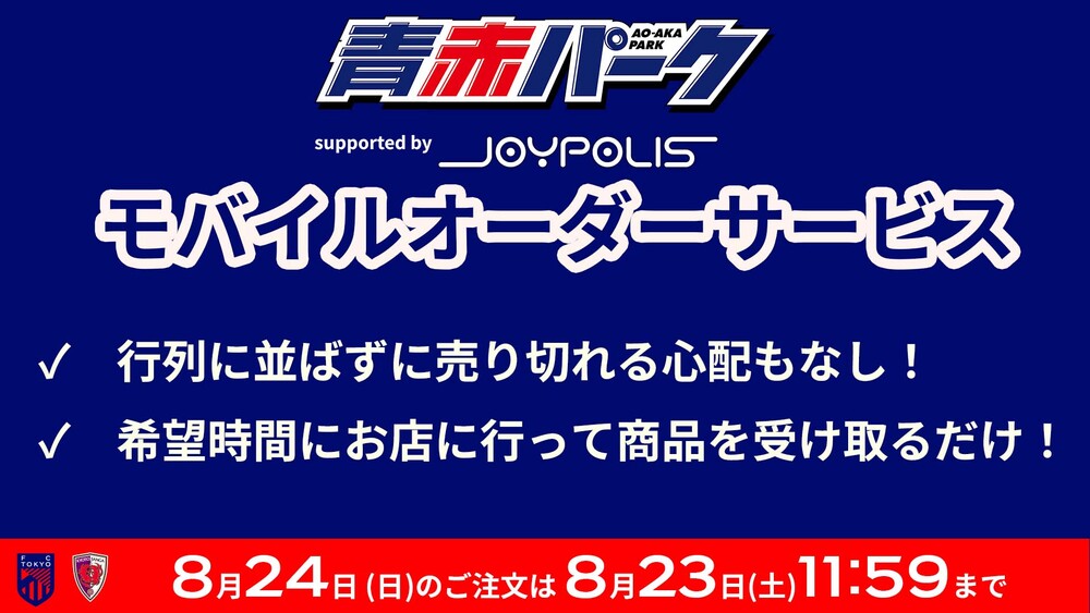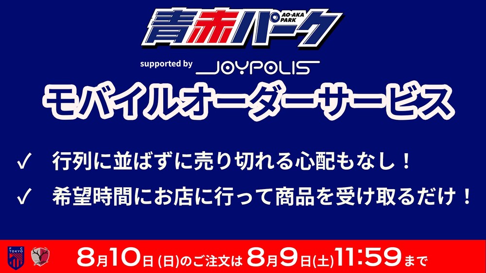 8月ホームゲームにおける青赤パークsupported by JOYPOLIS モバイルオーダーサービスのお知らせ