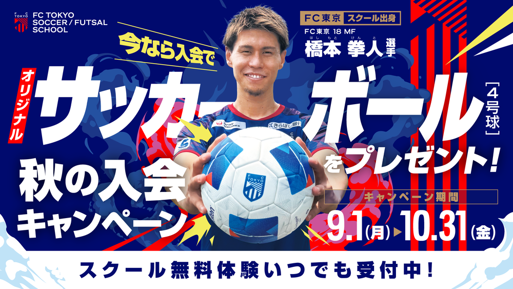 FC東京サッカー・フットサルスクールでは、9月1日(月)〜10月31日(金)の間で『秋の入会キャンペーン』を実施いたします。