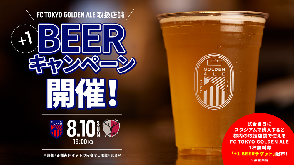 8月10日鹿島アントラーズ戦にて『FC TOKYO GOLDEN ALE』もしくは『FC TOKYO PALE ALE』をご購入いただいた方を対象に、都内でGOLDEN ALEを販売していただいている店舗にて使用可能な『+1 BEERチケット』(GOLDEN ALE無料券)を配布いたします。