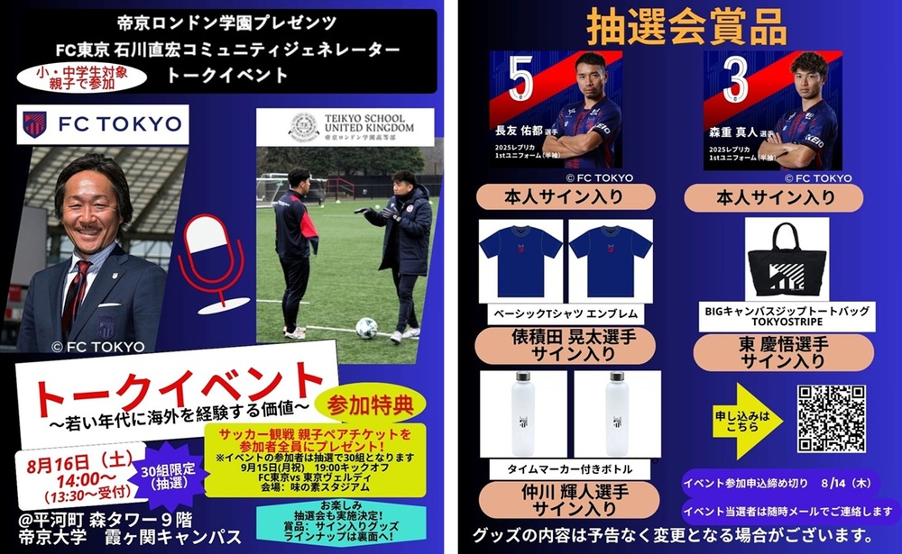 8月16日(土)帝京ロンドン学園にて『FC東京 石川直宏コミュニティジェネレータートークイベント』が開催されます。