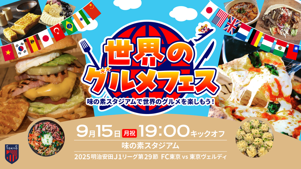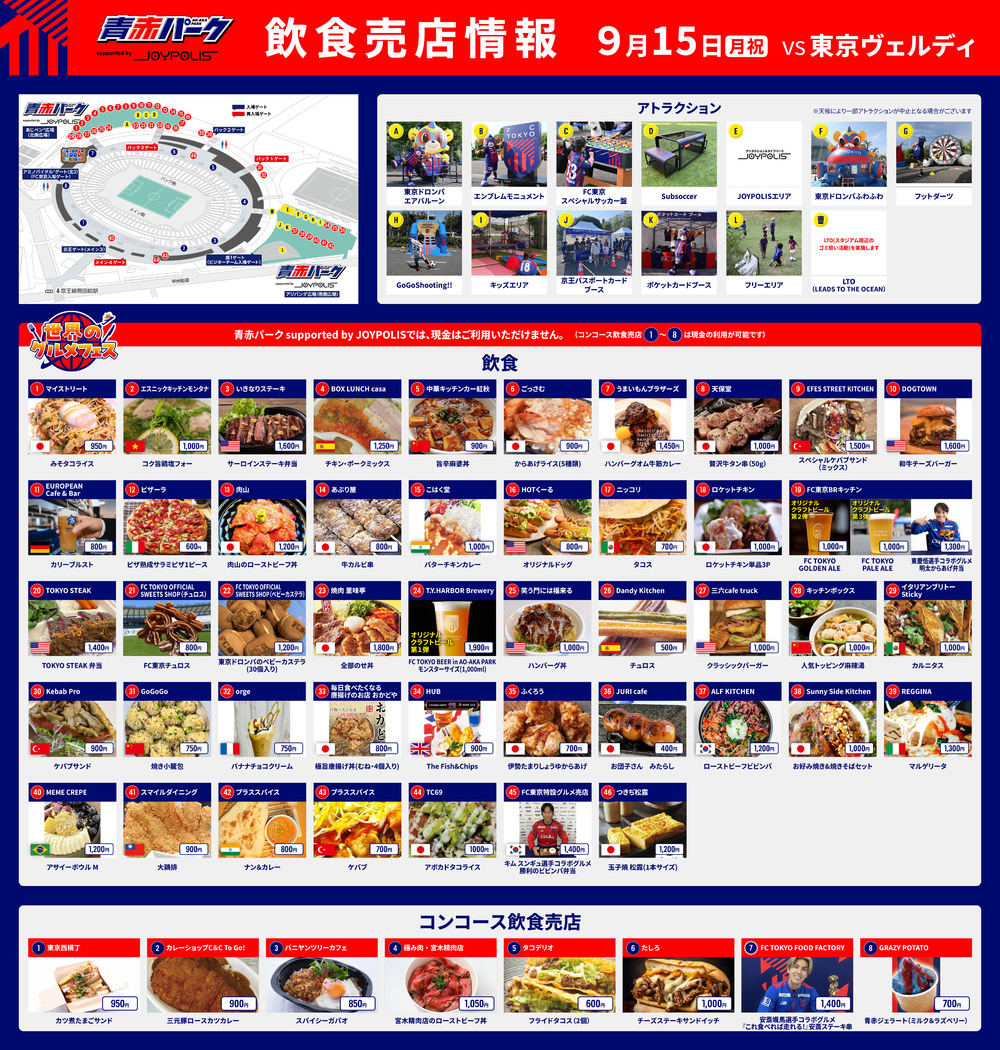 9月15日(月祝) 2025明治安田J1リーグ 第29節 vs東京ヴェルディ(19:00キックオフ/味の素スタジアム)の、青赤パークsupported by JOYPOLIS(場外)、出張!!青赤パーク supported by JOYPOLIS、スタジアム内コンコース(場内)売店にて販売する飲食情報をお知らせいたします。