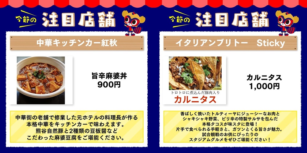 青赤パークsupported by JOYPOLISの店舗が①メイン側場外(ペデストリアンデッキ)、②コンコース(スタジアム内通路)臨時売店に登場します!