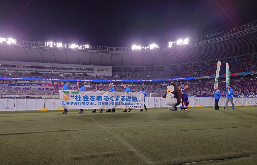 『社会を明るくする運動』調布市推進委員会と連携して、大型映像機での映像放映、ハーフタイムの周回などを実施予定です。