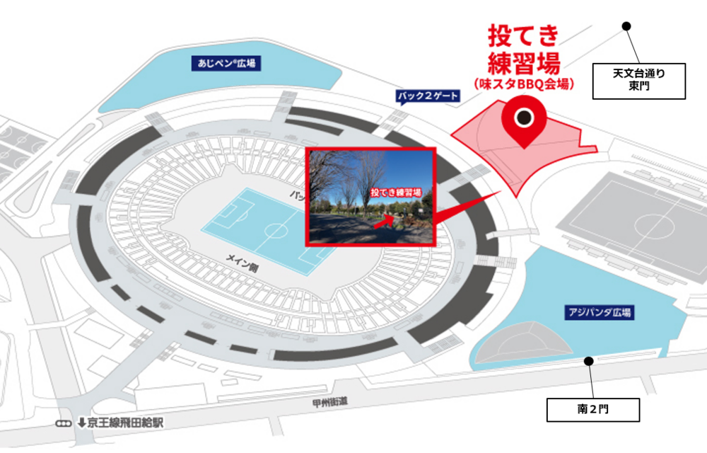 味スタBBQとは、味の素スタジアムにある投てき練習場を活用して実施する『天然芝×青空』の解放感を活かした屋外BBQイベントとなります。試合の有無にかかわらず多くのファン・サポ―ターのみなさん、またBBQファンの方々が楽しめる企画を実施いたします。