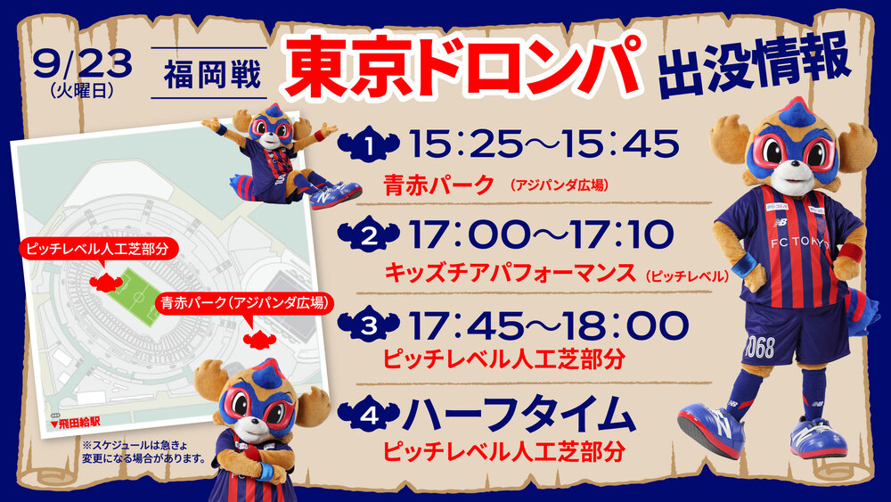 9月23日(火祝) 2025明治安田J1リーグ 第31節 vsアビスパ福岡(18:00キックオフ/味の素スタジアム)に東京ドロンパが下記の通りあらわれます。お楽しみに!