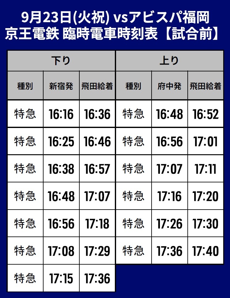 9月23日(火祝) 2025明治安田J1リーグ 第31節 vsアビスパ福岡(18:00キックオフ/味の素スタジアム)にて運行される臨時交通アクセス(鉄道)、シャトルバス・路線バスについてご案内いたします。