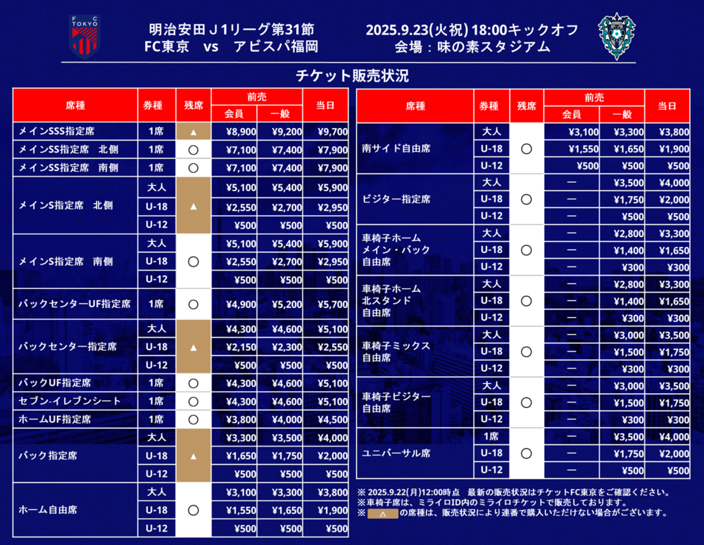 2025明治安田J1リーグ 第31節 FC東京 vs アビスパ福岡(18:00キックオフ/味の素スタジアム)の当日券販売につきまして、下記のとおりお知らせいたします。