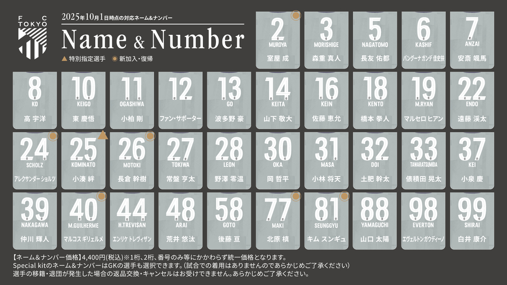 クラブオリジナルフォントのネーム&ナンバーとなります。