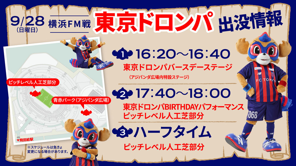 9月28日(日) 2025明治安田J1リーグ 第32節 vs横浜F・マリノス(18:00キックオフ/味の素スタジアム)に東京ドロンパが下記の通りあらわれます。