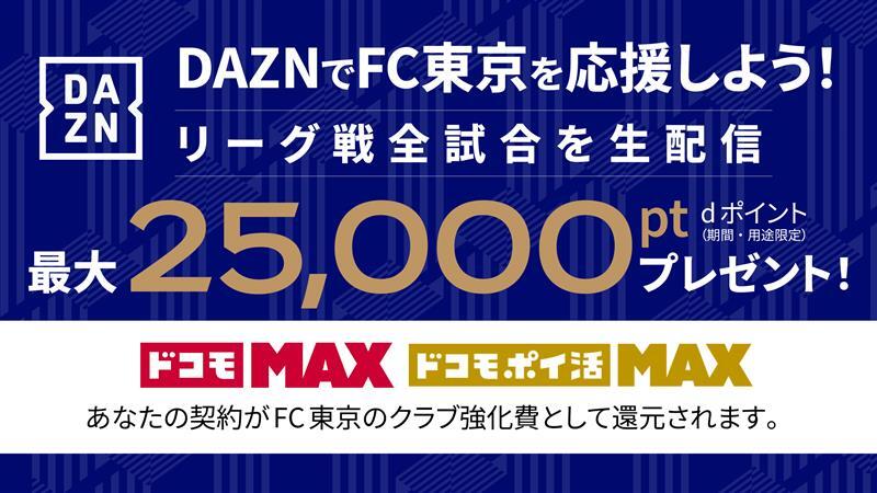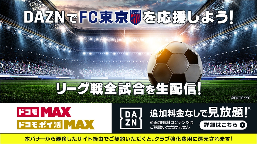 ドコモの料金プラン『ドコモ MAX』『ドコモ ポイ活 MAX』なら、動画配信サービス『DAZN』が追加料金なしで見放題!下記バナーを経由してこの料金プランにお申込みいただくと、ご契約金額の一部がFC東京の強化費用として寄付されます。