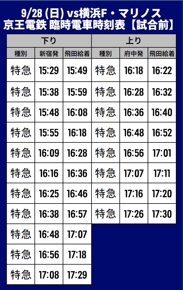 9月28日(日) 2025明治安田J1リーグ 第32節 vs横浜F・マリノス(18:00キックオフ/味の素スタジアム)にて運行される臨時交通アクセス(鉄道)、シャトルバス・路線バスについてご案内いたします。