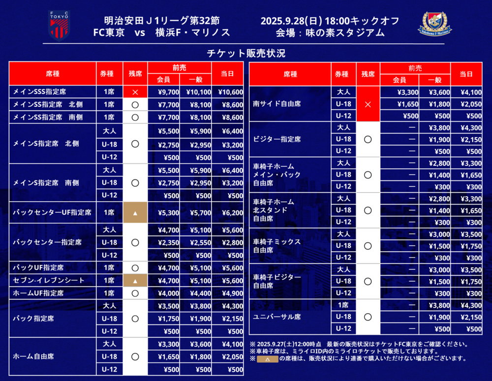 2025明治安田J1リーグ 第32節 FC東京 vs 横浜F・マリノス(18:00キックオフ/味の素スタジアム)の当日券販売につきまして、下記のとおりお知らせいたします。