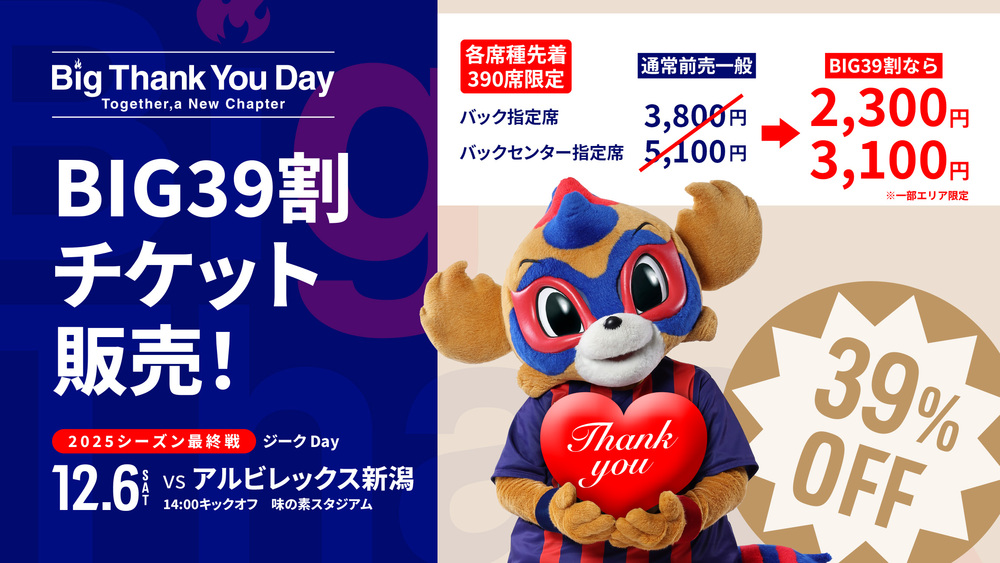 12月6日(土) 2025明治安田J1リーグ 第38節 vsアルビレックス新潟(14:00キックオフ/味の素スタジアム)にて開催される『Big Thank You Day』にちなみ、本試合限定で『BIG39割チケット』を販売いたします!