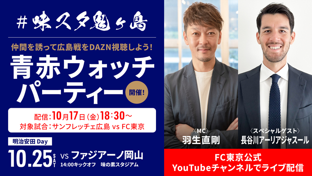 サッカーに詳しくない方も、FC東京が好きなアナタと観ることで、“仲間”になってくれること間違いなし。サッカー観戦初心者からFC東京のファン・サポーターのみなさまで幅広く楽しめるウォッチパーティーをライブ配信いたします。ぜひ、友人や家族を誘って、DAZN視聴しながらこちらのライブ配信をお楽しみください。