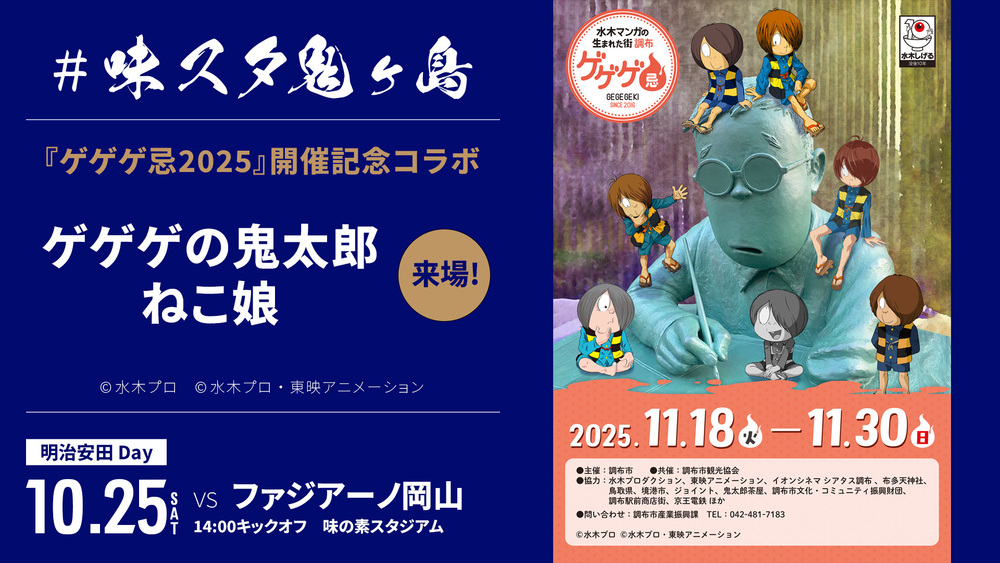10月25日(土)岡山戦では、『ゲゲゲ忌 2025』開催を記念してFC東京の『#味スタ鬼ヶ島』キャンペーンコラボが決定。ゲゲゲの鬼太郎とねこ娘が味の素スタジアムに来場してイベントに参加することが決まりました。