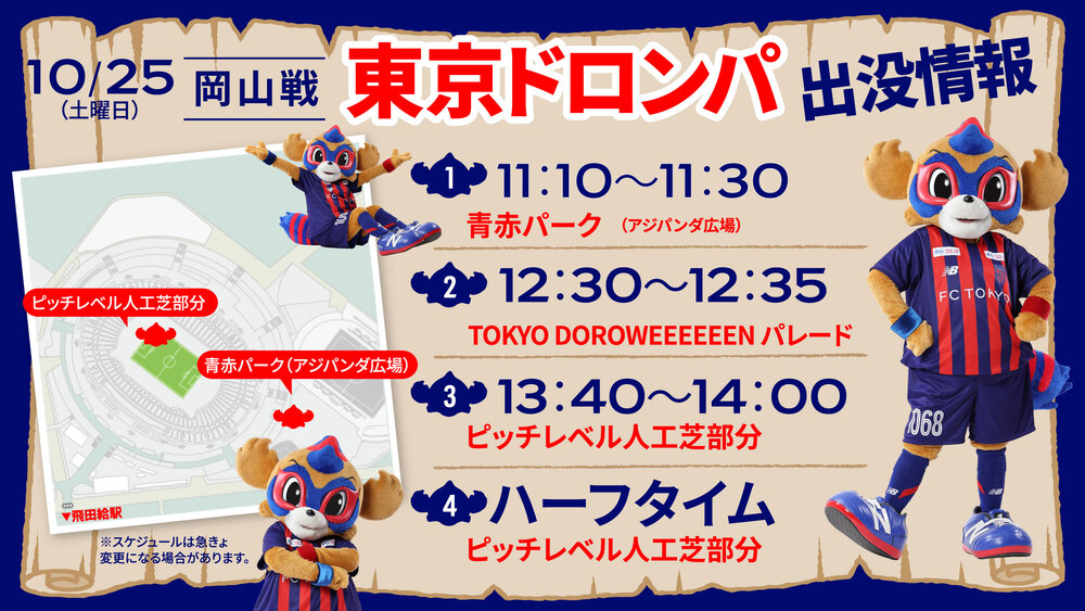 10月25日(土) 2025明治安田J1リーグ 第35節 vsファジアーノ岡山(14:00キックオフ/味の素スタジアム)に東京ドロンパが下記の通りあらわれます。お楽しみに!