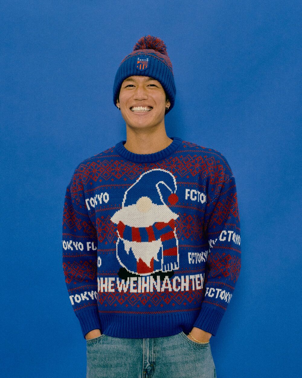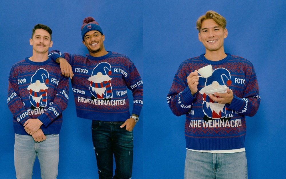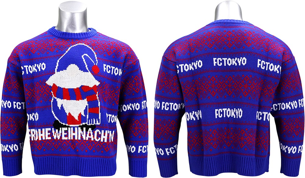 中央に青赤のサンタとドイツ語でFROHE WEIHNACHTEN (メリークリスマス)と大きく入れたFC東京オリジナルのアグリーセーターはオシャレになるかダサくなるかは着こなし方次第!?