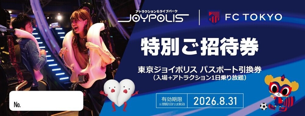 FC東京のホームゲーム時に開催される青赤アプリくじ supported by Paidyや、OFFICIAL MEMBERSHIP限定のオンラインお宝グッズ抽選会などで、東京ジョイポリスのチケットが当たります。奮ってご応募ください!