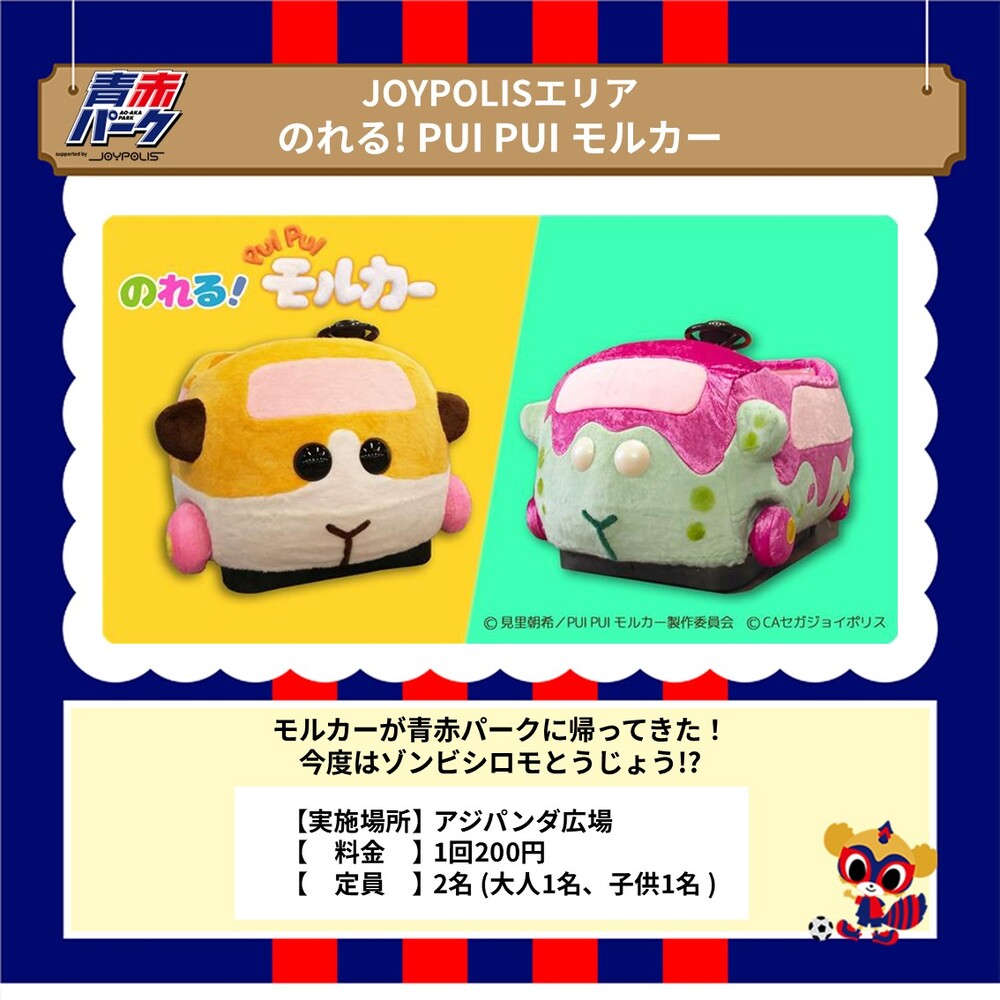 青赤パーク(アジパンダ広場(南側広場))内の『JOYPOLISエリア』にて、『OH!RING』、『のれる! PUI PUI モルカー』、『PUI PUI モルカー いっしょにドライブ♪』のコンテンツを実施します。OH!RINGは東京ジョイポリスで大人気のカーニバルゲーム。色が付いている穴にボールが止まれば景品ゲット!小さなお子さまでも簡単に遊べます。
