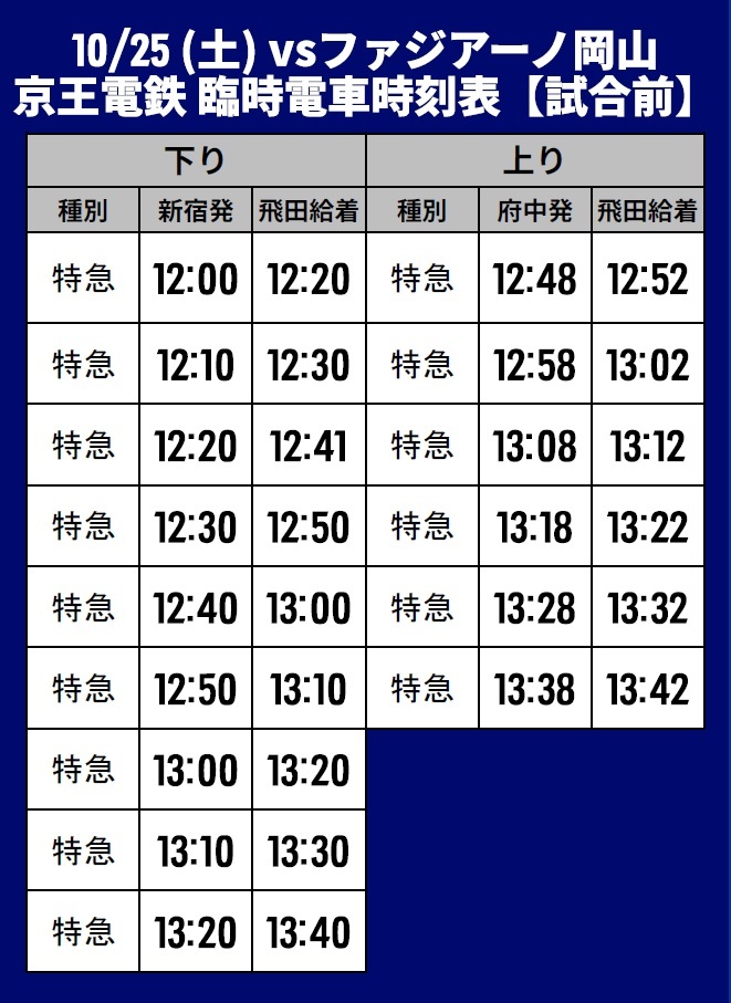 10月25日(土) 2025明治安田J1リーグ 第35節 vsファジアーノ岡山(14:00キックオフ/味の素スタジアム)にて運行される臨時交通アクセス(鉄道)、シャトルバス・路線バスについてご案内いたします。
