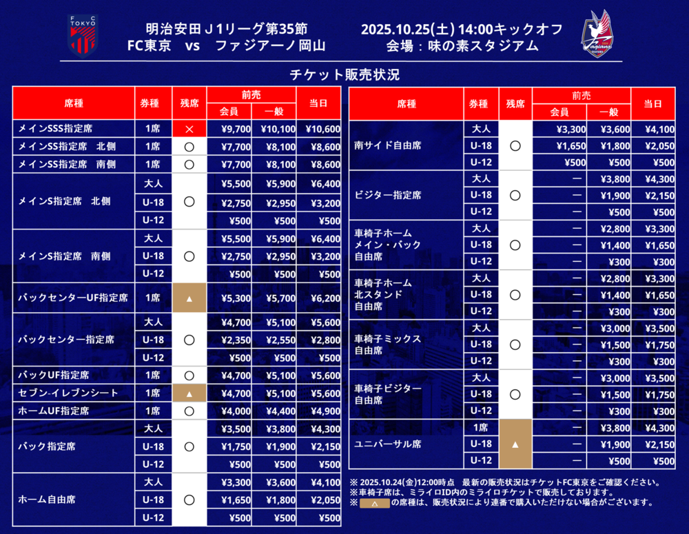 2025明治安田 J1リーグ 第35節 FC東京 vsファジアーノ岡山(14:00キックオフ/味の素スタジアム)の当日券販売につきまして、下記のとおりお知らせいたします。