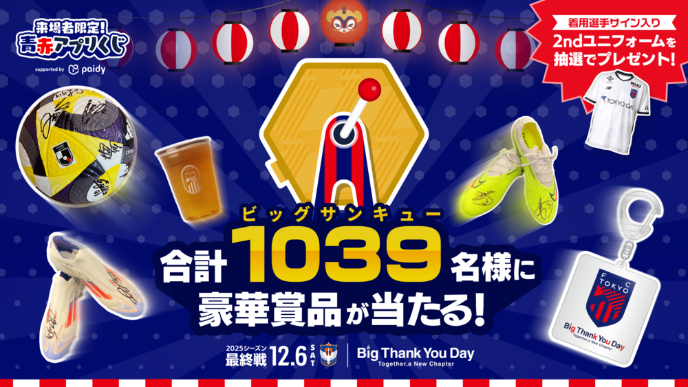 12月6日(土) 2025明治安田J1リーグ第38節 vsアルビレックス新潟(14:00キックオフ/味の素スタジアム)にて、FC東京公式アプリを活用した来場者限定の『青赤アプリくじ supported by Paidy』を実施します。